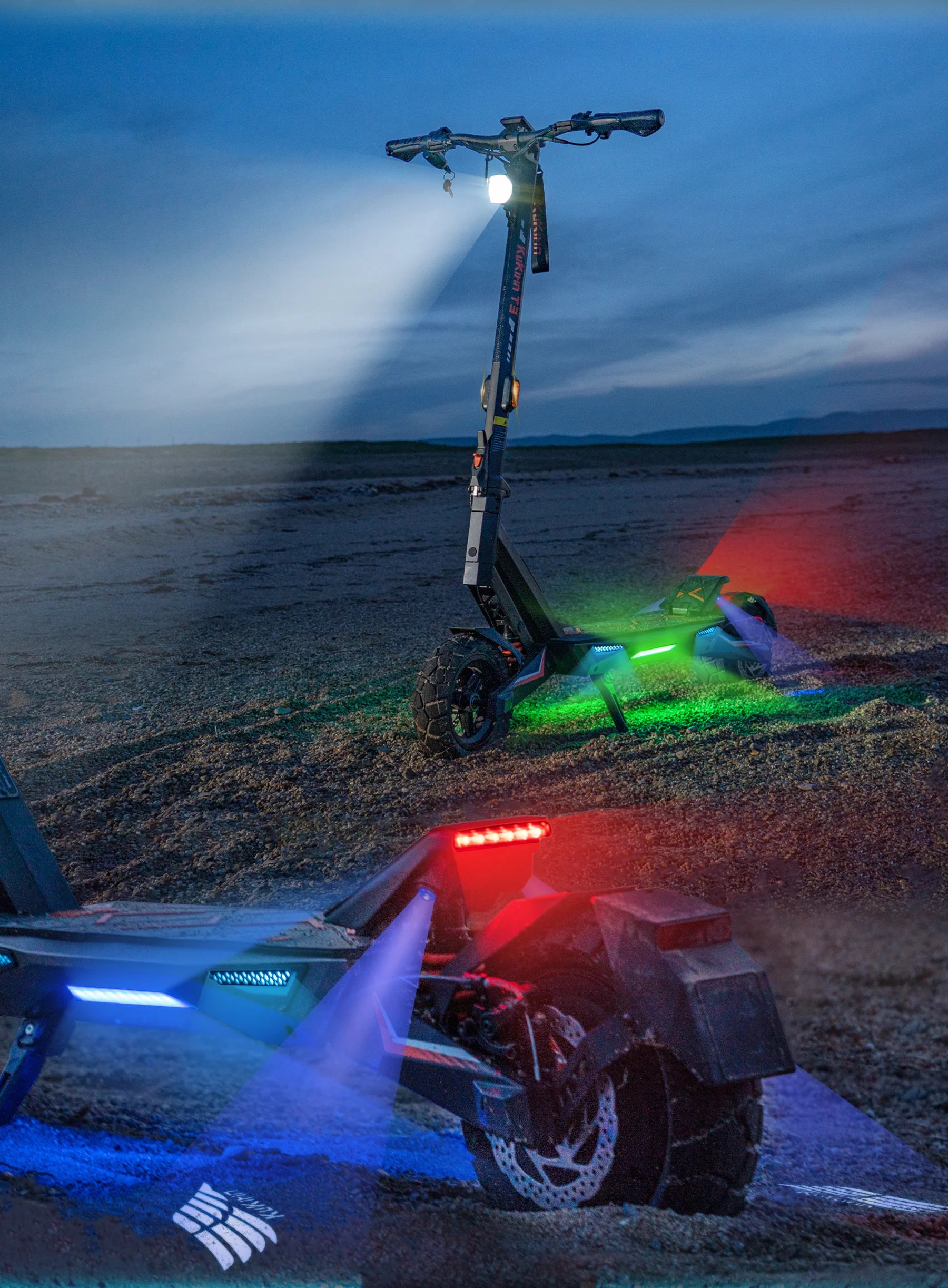Cuenta con un diseño de luces único en KuKirin, con luces laterales RGB y proyección trasera con efecto de alas azules que le dan un aspecto deportivo e imposible de olvidar.