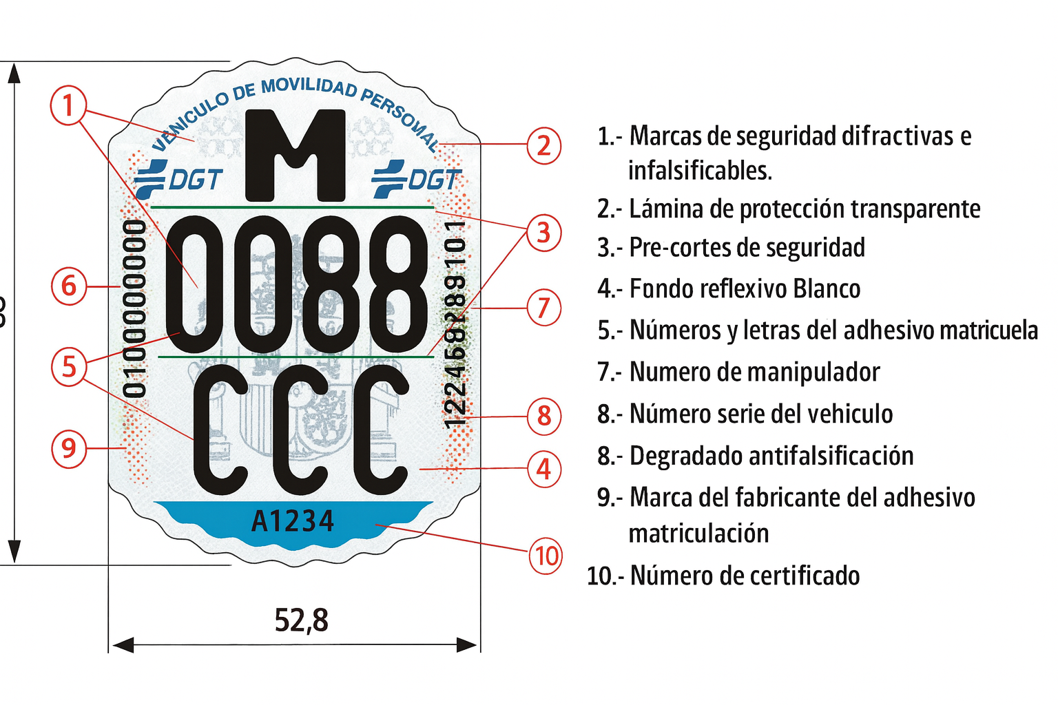 Placa identificativa obligatoria para vehículos de movilidad personal (VMP) según la normativa de la DGT. Esta matrícula homologada es válida para cualquier modelo y marca de patinete eléctrico compatible con la normativa española.